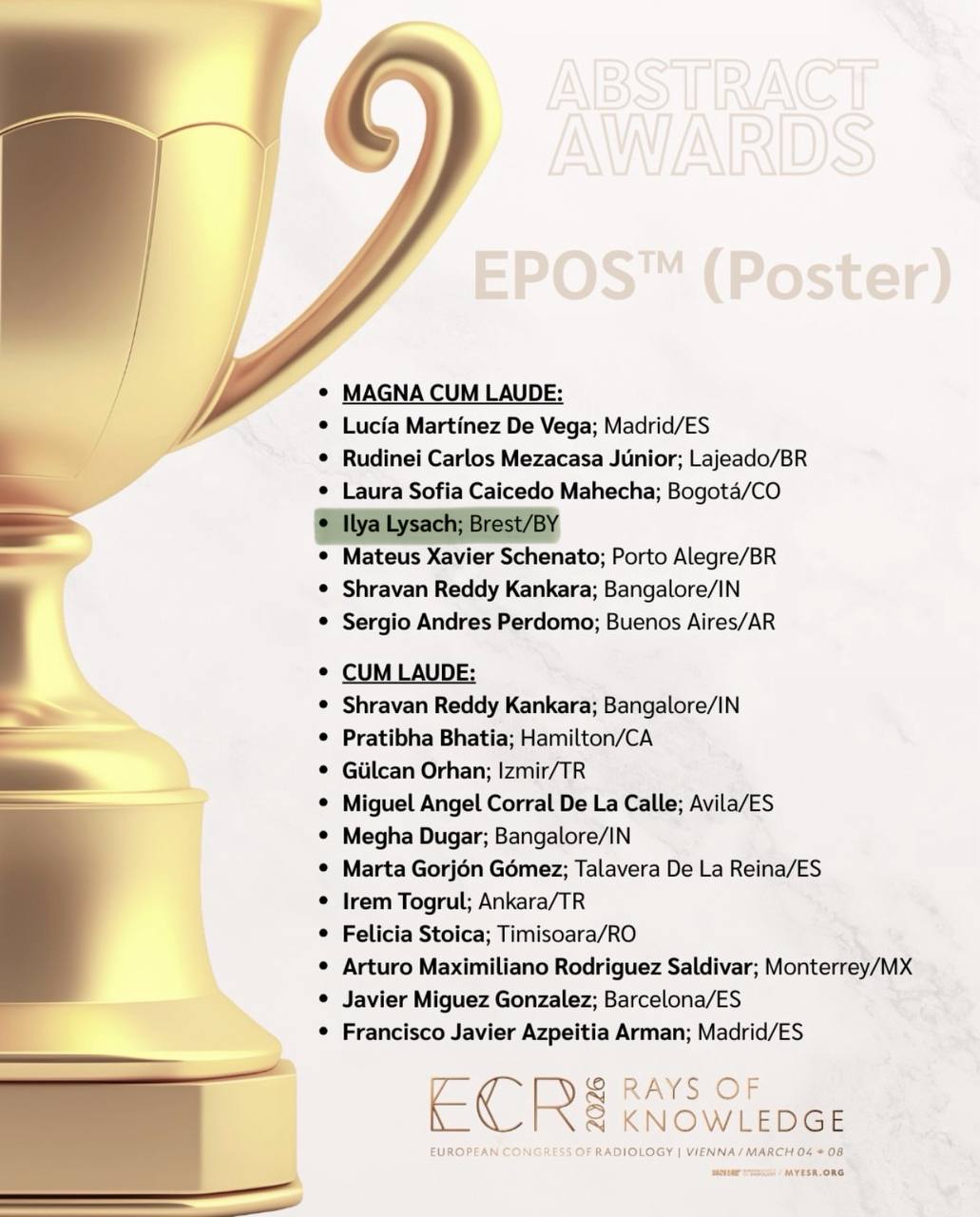 Поздравляем врача лучевой диагностики (заведующего) кабинета МРТ УЗ «Брестская городская больница СМП» Лысача Илью Геннадьевича с победой в конкурсе! Илья Николаевич не только представил на Европейском конгрессе радиологов 2026 доклад «MRI of temporomandibular joint: anatomy and dysfunction», но и получил за него престижную награду EPOS Award «Magna Cum Laude».