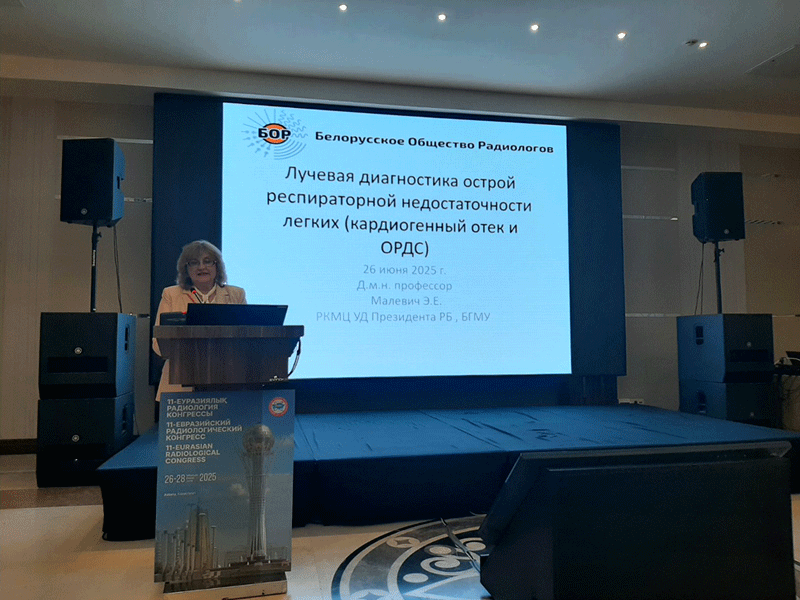 Д.м.н., профессор Малевич Эльвира Евгеньевна, врач-рентгенолог рентгеновского отделения ГУ «Республиканский клинический медицинский центр» Управления делами Президента Республики Беларусь (Минск) выступила с докладом «Лучевая диагностика острой респираторной недостаточности легких».