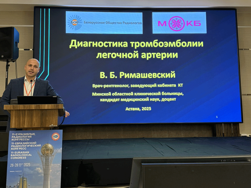 К.м.н., доцент Римашевский Виталий Брониславович, врач-рентгенолог (заведующий) кабинета РКТ УЗ «Минская областная клиническая больница» выступил с докладом «Диагностика тромбоэмболии легочной артерии».