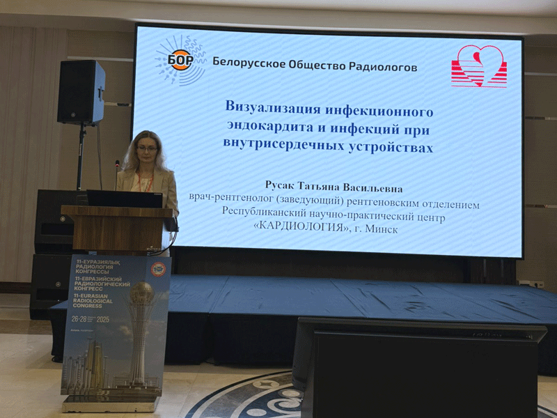 Русак Татьяна Васильевна, врач-рентгенолог (заведующий) рентгеновского отделения ГУ «РНПЦ «Кардиология»» (Минск) выступила с докладом «Визуализация инфекционного эндокардита и инфекций при внутрисердечных устройствах».