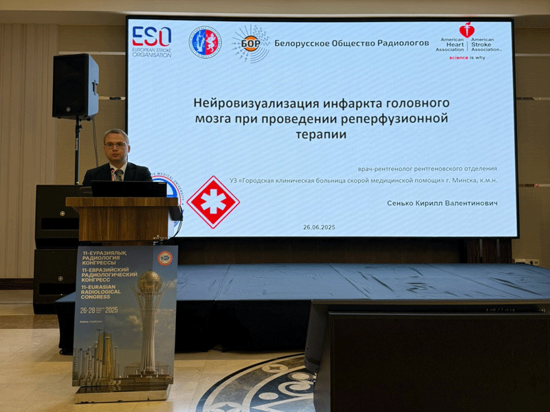 К.м.н. Сенько Кирилл Валентинович, врач-рентгенолог рентгеновского отделения УЗ «Городская клиническая больница скорой медицинской помощи» г. Минска выступил с докладом «Нейровизуализация инфаркта головного мозга при проведении реперфузионной терапии».